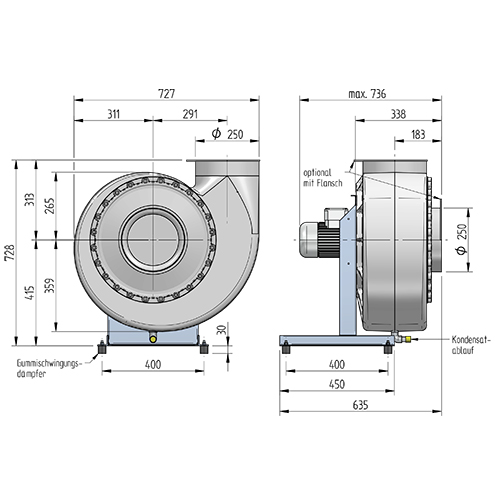 HF - radial fan, electrical conductive version direct driven complies with the European Ecodesign Directive ErP Corrosion resistant plastic radial fan with housing in PE-el, electrical conductive, sintered, single inlet, inlet nozzle with seal as inspection opening, easy removal, condensate pipe at lowest point of the housing, splinter protection according to accident prevention rules as plastic coated wire mesh. Impeller in PP-el with backward curved blades, electrical conductive, statically and dynamically balanced, quality of balancing at least to G 6.3 (DIN ISO 21940-11), mounted with Taper lock-bush on motor shaft. Fan frame in strong, welded steel construction, galvanized, with motor support plate. Fan frame suitable for mounting the housing with impeller and motor. Minimum gap seal at the shaft passage. Vibration dampers made of rubber and flexible connections with VA-tightening straps for suction and pressure side are included. Volume flow : 750- 2800 m³/h Static pressure difference : 625- 146 Pa Housing position : GR 360 (selectable in 45° steps) Motor power : 0,75 kW Motor speed : 1445 1/min Voltage : 3~ 230/400 V Frequency : 50 Hz Rated current : 1,85 A Enclosure/motor protection : IP 55/PTC Classification for hazardous area : II 2G Ex db eb IIC T4 Gb Motor suitable for VFD : yes ATEX Fan Ex-proof : Ex II 2G Ex h IIB+H2 T4 Gb Inner demand : category 2 (Zone 1) Temperature class : T4 (135 °C) Outer demand : category 2 (Zone 1) Temperature class : T4 (135 °C) |