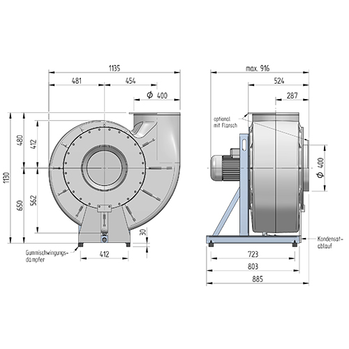 HF - radial fan, electrical conductive version direct driven complies with the European Ecodesign Directive ErP Corrosion resistant plastic radial fan with housing in PE-el, electrical conductive, sintered, single inlet, inlet nozzle with seal as inspection opening, easy removal, condensate pipe at lowest point of the housing, splinter protection according to accident prevention rules as plastic coated wire mesh. Impeller in PP-el with backward curved blades, electrical conductive, statically and dynamically balanced, quality of balancing at least to G 6.3 (DIN ISO 21940-11), mounted with Taper lock-bush on motor shaft. Fan frame in strong, welded steel construction, galvanized, with motor support plate. Fan frame suitable for mounting the housing with impeller and motor. Minimum gap seal at the shaft passage. Vibration dampers made of rubber and flexible connections with VA-tightening straps for suction and pressure side are included. Volume flow : 2000- 8000 m³/h Static pressure difference : 1299- 419 Pa Housing position : GR 360 (selectable in 45° steps) Motor power : 3,0 kW Motor speed : 1455 1/min Voltage : 3~ 230/400 V Frequency : 50 Hz Rated current : 6,05 A Enclosure/motor protection : IP 55/PTC Classification for hazardous area : II 2G Ex db eb IIC T4 Gb Motor suitable for VFD : yes ATEX Fan Ex-proof : Ex II 2G Ex h IIB+H2 T4 Gb Inner demand : category 2 (Zone 1) Temperature class : T4 (135 °C) Outer demand : category 2 (Zone 1) Temperature class : T4 (135 °C) |