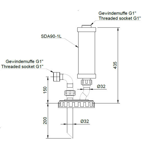 - Filling connection 90° d32 with screw connection with PE-el /EPDM and PE-el threaded socket G 1" IG
