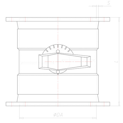 | - PP-EL-s butterfly valve with handle, 15° grid, with seal, with flange. - Manufactured to seal airtightly in accordance with DIN 1946 Part 4 and to avoid air transport after sealing, which reduces the air hygiene quality of the building. Round plastic molded part with welded-on socket flanges for installation in an exhaust system using flanges. - As a butterfly valve for adjusting or shutting off volume flows. - Flange dimensions according to company standards, see subcategory flanges. - Manufacturing process: Manufactured from injection molded parts up to d400. - Possible negative overpressure on request after mechanical, chemical and thermal stress. |