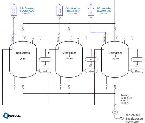 IntroductionIn both municipal and industrial plants, the chemical stability of process media is a crucial factor for safe and economical operation. A frequently underestimated source of disturbance is the ingress of carbon dioxide (CO₂) from the ambient air. Even small amounts can cause pH shifts in alkaline solutions, lead to carbonate formation, and introduce impurities into the water. This not only causes operational difficulties but can also negatively impact plant availability. This is particularly critical in the treatment of boiler and feedwater for steam generators. High water quality standards are required here to ensure operational safety, regulatory compliance, and plant efficiency. Natural raw water or municipal supply water cannot meet these requirements without additional treatment. TaskStadtwerke Flensburg GmbH approached Kwerk GmbH with the requirement to implement a solution for stabilizing conductivity in deionized water tanks. The key objective was not to improve water quality, but to prevent CO₂ ingress — and thus to avoid an increase in conductivity. The chosen solution was pressure-loss-optimized CO₂ absorbers of type SDA400-CO₂, designed for an air flow rate of 50 m³/h. These units are equipped with DN100 flange connections, allowing them to be easily retrofitted onto the deionized water tanks. |