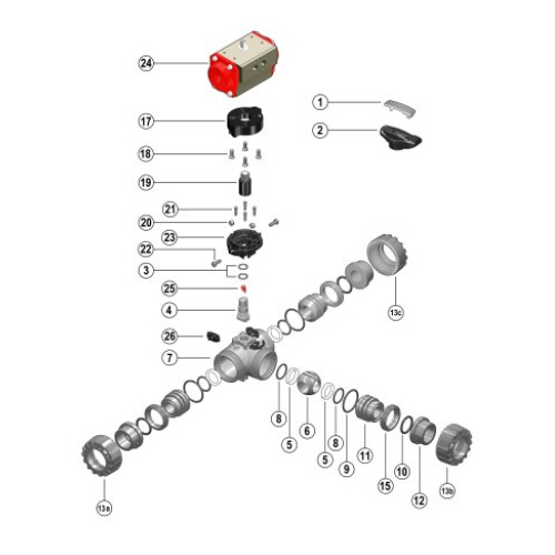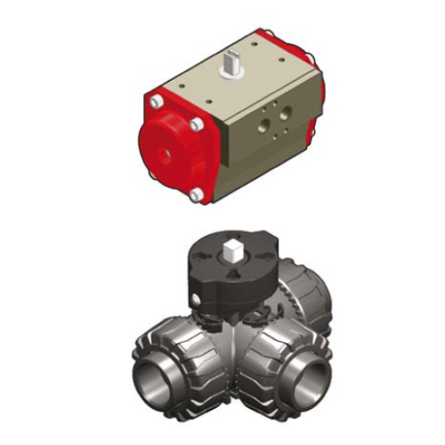 | PVC-C 3-Way Ball Valve, Dual Block, Pneumatically actuated Actuators: - Standard control pressure: min 5 bar, max 10 bar. - Reduced control pressure actuators on request Type of working: - DA - double acting: opening and closing movements by air - SA - single acting: opening movement by air, closing movement by springs (NC normally closed NO normally open) Options Accessories: - optical position indicator* - electro pneumatic positioner - pneumatic positioner - limit-switches box - 3-5/2 way pilot solenoid valve *standard on VKD/CP - NO |