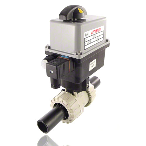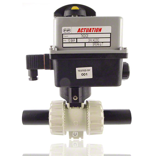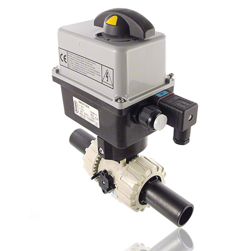 PP 2-Way Ball Valve, Dual Block, Electrically actuated ** DN50 PN16 on request Electric actuator with plastic housing. - Temperature: -10° C / +55° C Electrical connections Power supply: - 90-240V / 50-60Hz (AC), (24V AC / DC) without surcharge available - other voltages on request - connector DIN 43650 3P+T - Limit switches: gland ISO M20 Standard equipment: - Emergency manual override - Visual position indicator - 2 auxiliary and adjustable limit switches FC1, FC2 (5A)Torque limiter Options: - Positioner 4-20 mA or 0-10V - Fail safe security block - Heating resistor - Feed back potentiometer 100 - 1000 - 5000 - 10000 Ohm - position transmitter - 2 additional limit switches - IP67 or ATEX EEx |