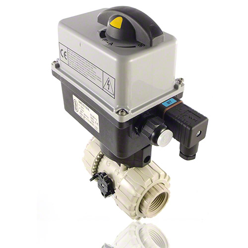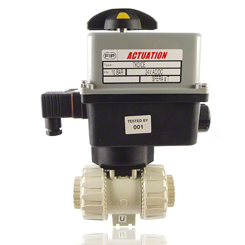 PP 2-Way Ball Valve, Dual Block, Electrically actuated ** DN50 PN16 on request Electric actuator with plastic housing. - Temperature: -10° C / +55° C Electrical connections Power supply: - 90-240V / 50-60Hz (AC), (24V AC / DC) without surcharge available - other voltages on request - connector DIN 43650 3P+T - Limit switches: gland ISO M20 Standard equipment: - Emergency manual override - Visual position indicator - 2 auxiliary and adjustable limit switches FC1, FC2 (5A)Torque limiter Options: - Positioner 4-20 mA or 0-10V - Fail safe security block - Heating resistor - Feed back potentiometer 100 - 1000 - 5000 - 10000 Ohm - position transmitter - 2 additional limit switches - IP67 or ATEX EEx |