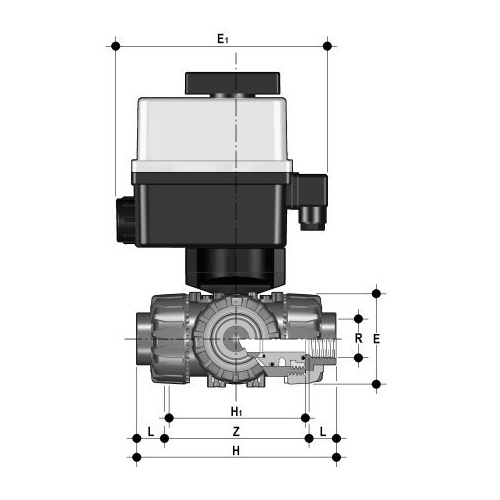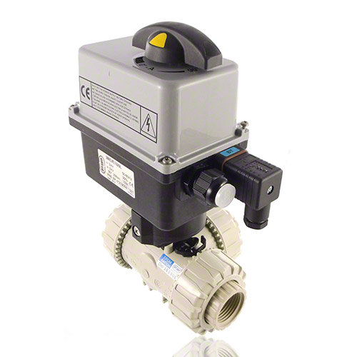 PP 3-Way Ball Valve, Dual Block, Electrically actuated Electric actuator with plastic housing. - Temperature: -10° C / +55° C Electrical connections Power supply: - 90-240V / 50-60Hz (AC), (24V AC / DC) without surcharge available - other voltages on request - connector DIN 43650 3P+T - Limit switches: gland ISO M20 Standard equipment: - Emergency manual override - Visual position indicator - 2 auxiliary and adjustable limit switches FC1, FC2 (5A)Torque limiter Options: - Positioner 4-20 mA or 0-10V - Fail safe security block - Heating resistor - Feed back potentiometer 100 - 1000 - 5000 - 10000 Ohm - position transmitter - 2 additional limit switches - IP67 or ATEX EEx |