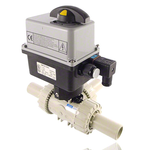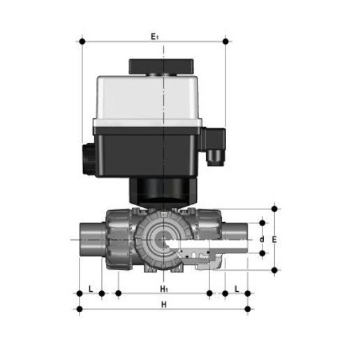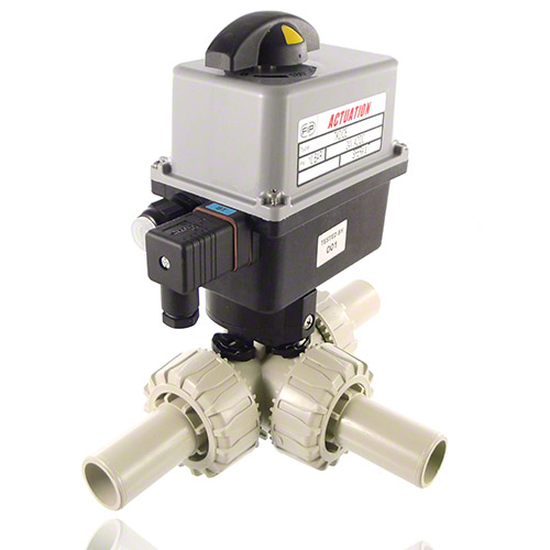 PP 3-Way Ball Valve / T-bore ball, Electrically actuated, PP SDR 11 male end, EPDM