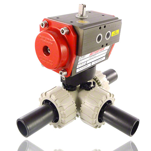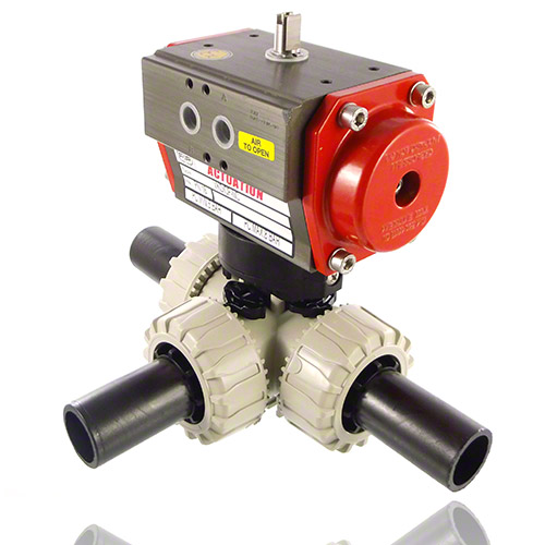 PP 3-Way Ball Valve / T-bore ball, Pneumatically actuated, PE100 SDR 11 male end, SA - single acting, EPDM