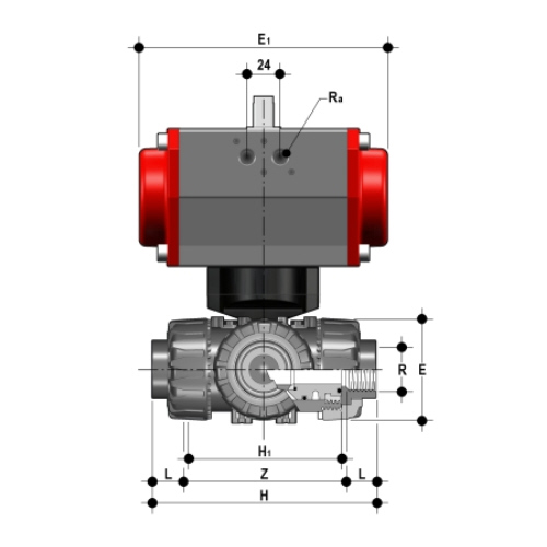 | PP 3-Way Ball Valve, Dual Block, Pneumatically actuated Actuators: - Standard control pressure: min 5 bar, max 10 bar. - Reduced control pressure actuators on request Type of working: - DA - double acting: opening and closing movements by air - SA - single acting: opening movement by air, closing movement by springs (NC normally closed NO normally open) Options Accessories: - optical position indicator* - electro pneumatic positioner - pneumatic positioner - limit-switches box - 3-5/2 way pilot solenoid valve *standard on VKD/CP - NO |