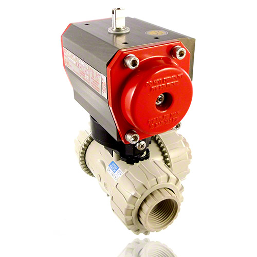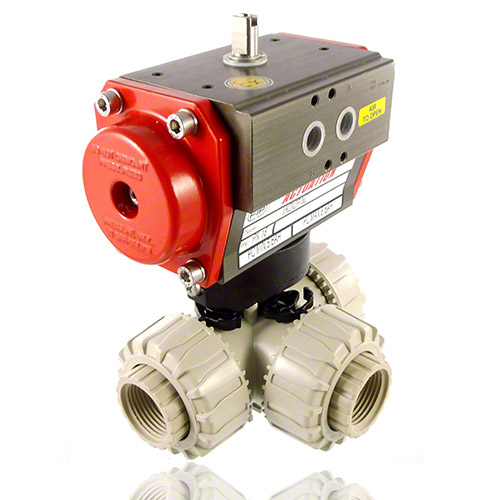 PP 3-Way Ball Valve / T-bore ball, Pneumatically actuated, threaded female ends, DA - double acting, FPM