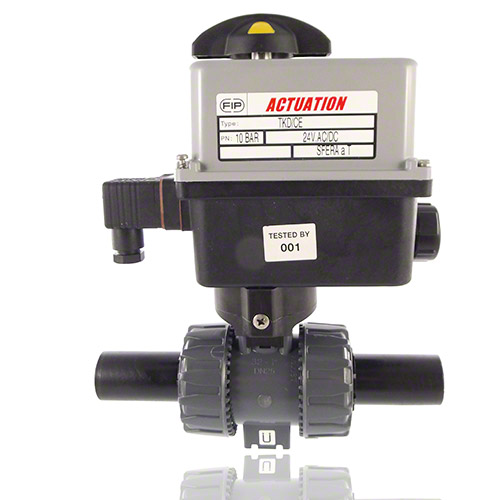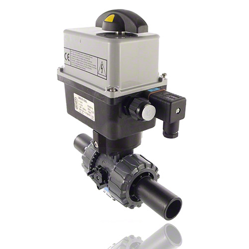 PVC-U 2-Way Ball Valve, Dual Block, Electrically actuated ** DN50 PN16 on request Electric actuator with plastic housing. - Temperature: -10° C / +55° C Electrical connections Power supply: - 90-240V / 50-60Hz (AC), (24V AC / DC) without surcharge available - other voltages on request - connector DIN 43650 3P+T - Limit switches: gland ISO M20 Standard equipment: - Emergency manual override - Visual position indicator - 2 auxiliary and adjustable limit switches FC1, FC2 (5A)Torque limiter Options: - Positioner 4-20 mA or 0-10V - Fail safe security block - Heating resistor - Feed back potentiometer 100 - 1000 - 5000 - 10000 Ohm - position transmitter - 2 additional limit switches - IP67 or ATEX EEx |