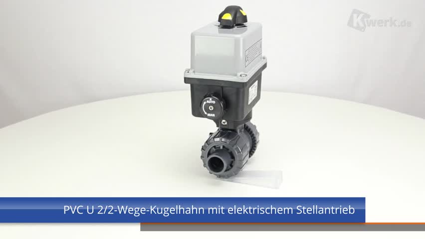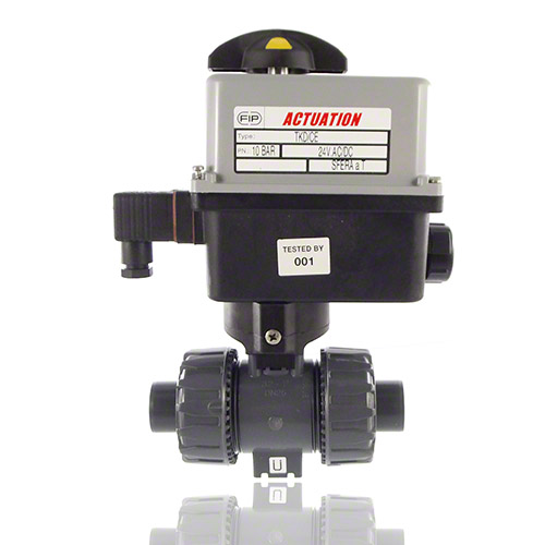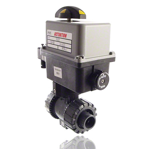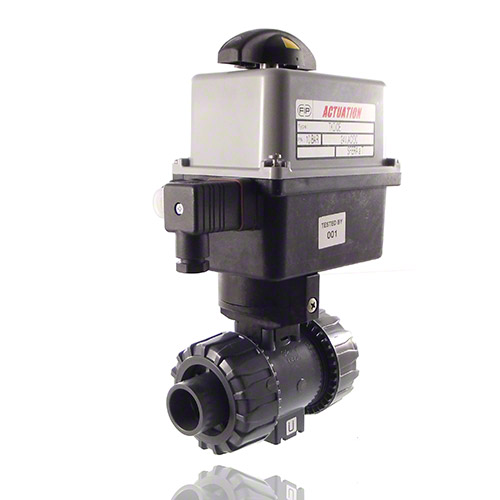 PVC-U 2-Way Ball Valve, Dual Block, Electrically actuated ** DN50 PN16 on request Electric actuator with plastic housing. - Temperature: -10° C / +55° C Electrical connections Power supply: - 90-240V / 50-60Hz (AC), (24V AC / DC) without surcharge available - other voltages on request - connector DIN 43650 3P+T - Limit switches: gland ISO M20 Standard equipment: - Emergency manual override - Visual position indicator - 2 auxiliary and adjustable limit switches FC1, FC2 (5A)Torque limiter Options: - Positioner 4-20 mA or 0-10V - Fail safe security block - Heating resistor - Feed back potentiometer 100 - 1000 - 5000 - 10000 Ohm - position transmitter - 2 additional limit switches - IP67 or ATEX EEx |