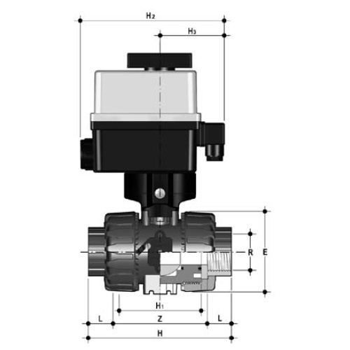 PVC-U 2-Way Ball Valve, Dual Block, Electrically actuated ** DN50 PN16 on request Electric actuator with plastic housing. - Temperature: -10° C / +55° C Electrical connections Power supply: - 90-240V / 50-60Hz (AC), (24V AC / DC) without surcharge available - other voltages on request - connector DIN 43650 3P+T - Limit switches: gland ISO M20 Standard equipment: - Emergency manual override - Visual position indicator - 2 auxiliary and adjustable limit switches FC1, FC2 (5A)Torque limiter Options: - Positioner 4-20 mA or 0-10V - Fail safe security block - Heating resistor - Feed back potentiometer 100 - 1000 - 5000 - 10000 Ohm - position transmitter - 2 additional limit switches - IP67 or ATEX EEx |