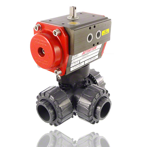 PVC-U 3-Way Ball Valve / L-bore ball, Pneumatically actuated, plain female ends, SA - single acting, FPM