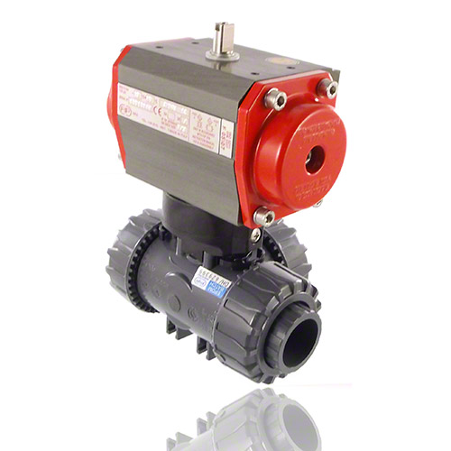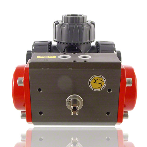 | PVC-U 3-Way Ball Valve, Dual Block, Pneumatically actuated Actuators: - Standard control pressure: min 5 bar, max 10 bar. - Reduced control pressure actuators on request Type of working: - DA - double acting: opening and closing movements by air - SA - single acting: opening movement by air, closing movement by springs (NC normally closed NO normally open) Options Accessories: - optical position indicator* - electro pneumatic positioner - pneumatic positioner - limit-switches box - 3-5/2 way pilot solenoid valve *standard on VKD/CP - NO |