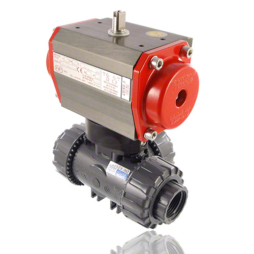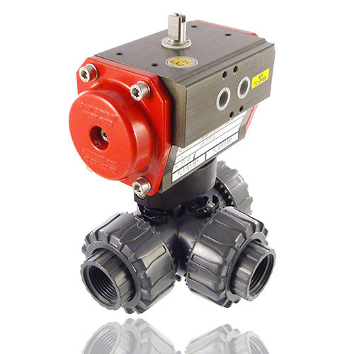 PVC-U 3-Way Ball Valve / T-bore ball, Pneumatically actuated, threaded female ends, SA - single acting, FPM