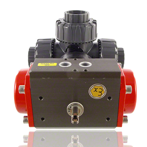 | PVC-U 3-Way Ball Valve, Dual Block, Pneumatically actuated Actuators: - Standard control pressure: min 5 bar, max 10 bar. - Reduced control pressure actuators on request Type of working: - DA - double acting: opening and closing movements by air - SA - single acting: opening movement by air, closing movement by springs (NC normally closed NO normally open) Options Accessories: - optical position indicator* - electro pneumatic positioner - pneumatic positioner - limit-switches box - 3-5/2 way pilot solenoid valve *standard on VKD/CP - NO |