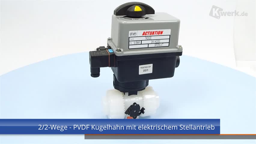 PVDF 2-Way Ball Valve, Dual Block, Electrically actuated ** DN50 PN16 on request Electric actuator with plastic housing. - Temperature: -10° C / +55° C Electrical connections Power supply: - 90-240V / 50-60Hz (AC), (24V AC / DC) without surcharge available - other voltages on request - connector DIN 43650 3P+T - Limit switches: gland ISO M20 Standard equipment: - Emergency manual override - Visual position indicator - 2 auxiliary and adjustable limit switches FC1, FC2 (5A)Torque limiter Options: - Positioner 4-20 mA or 0-10V - Fail safe security block - Heating resistor - Feed back potentiometer 100 - 1000 - 5000 - 10000 Ohm - position transmitter - 2 additional limit switches - IP67 or ATEX EEx |