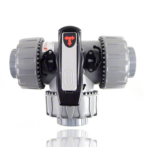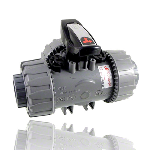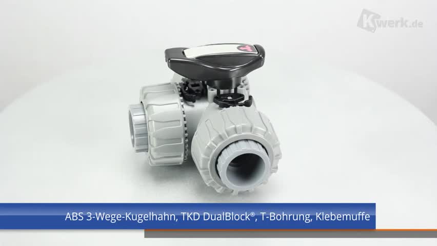 | DUAL BLOCK® 3-way ball valve with female ends for solvent welding, metric series L-port ball - Construction : 3-way True Union ball valve with locked carrier and union nuts - Nominal pressure PN 16 with water at 20 °C - Temperature range -40 °C - 60 °C - Valve material ABS - Seal material - EPDM , PTFE (ball seats) - Control options: Manual control; electric actuator; pneumatic actuator |