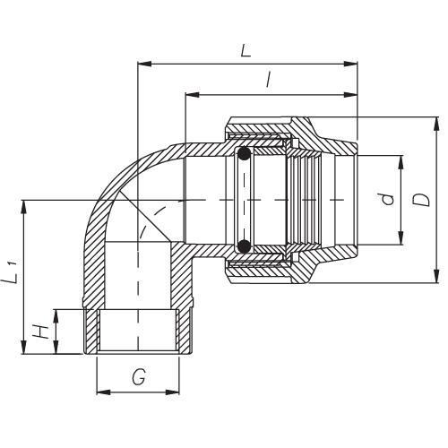 PP Compression fittings type UNIDELTA for PE pipes, angle 90° with internal thread
