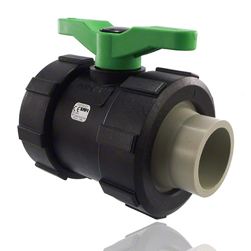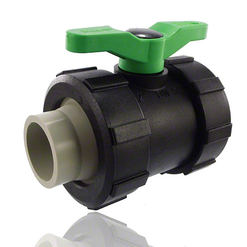 2-ways ball valve PPGF, PP-H metric sockets, FPM = green handle