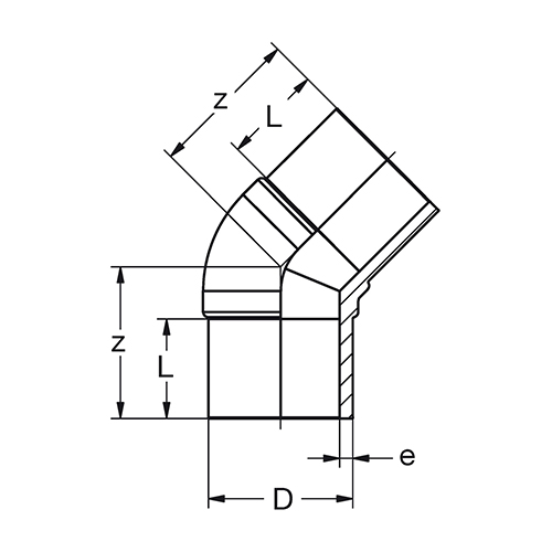 Injection molded parts, for butt welding and heating coil welding (long version only); without weakening factors. material PP-RCT (Polypropylene Random-Copolymer Temperature resistant) with modified crystal structure (beta nucleated) and increased temperature resistance, Borealis RA7050GN, color RAL 6024 traffic green. The material meets the requirements of the current KTW guidelines of the Federal Environment Agency (UBA). Geometric properties Outside diameter and wall thickness in accordance with DIN EN ISO 15874. Tolerances in the Z dimension specifications depend on the dimension. Up to d / D 160 = +/- 3 mm. From d / D 180 = +/- 10 mm. operating pressure The operating pressure depends on the SDR class and the pipe used. execution Suitable for heating element butt welding and heating coil socket welding in accordance with DVS guideline 2207. Welding equipment and welding tools should comply with DVS guideline 2208. Certification B-R molded parts are subject to regular internal and external quality controls. The molded parts meet the requirements of DIN Certco guidelines ZP 10.25.1 and NSF14 + 61 |