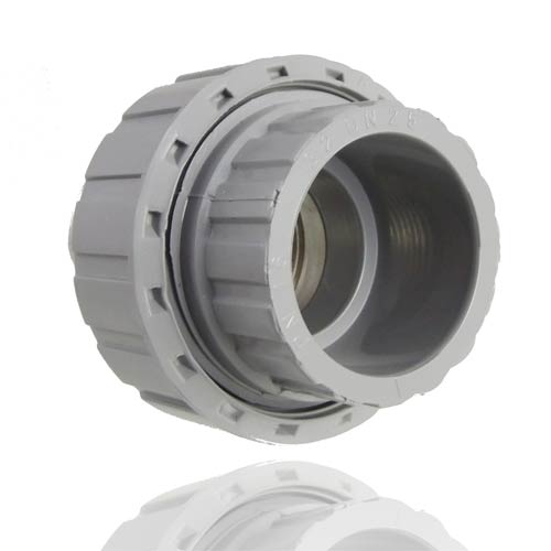 - Adaptor union in PVC-C/STAINLESS steel with solvent weld socket d and BSP threaded STAINLESS steel female end R with O-Ring in EPDM