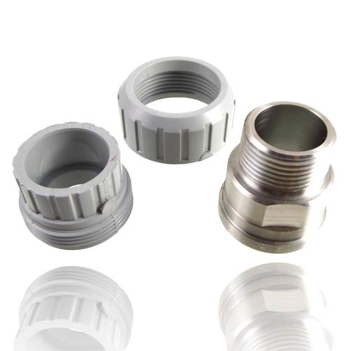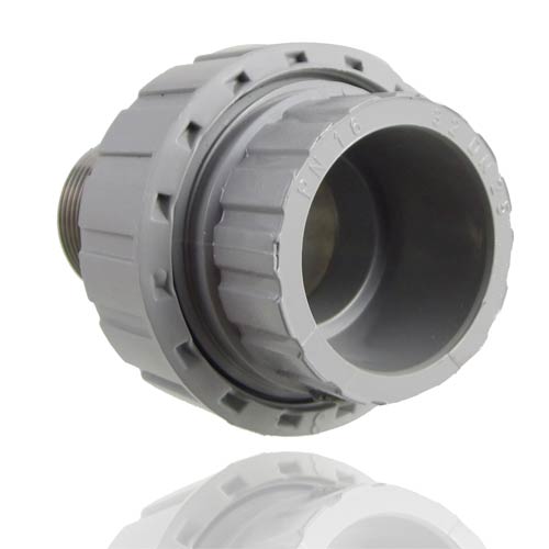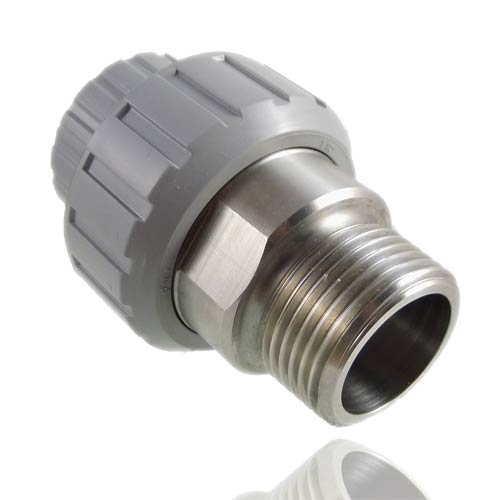 - Adaptor union in PVC-C/STAINLESS steel with solvent weld socket d and BSP threaded STAINLESS steel male end R with O-Ring in EPDM