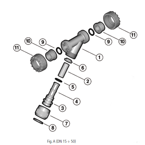 - Connection system for solvent weld, threaded and flanged joints - Strainer mounted on an easily removed support that facilitates the cleaning or replacement - Valve material compatibility (PVC-U) with water conveyance, drinking water and other food substances according to current regulations - Can be maintained with the valve body installed Construction Sediment strainer - Size range DN 10÷100 - Nominal pressure - PVC-U Grey DN 10÷50:PN 16 with water at 20 °C DN 65: PN 10 with water at 20 °C DN 80÷100: PN 6 with water at 20 °C PVC-U Transparent DN 10÷25: PN 16 with water at 20 °C DN 32÷50: PN 10 with water at 20 °C DN 65: PN 6 with water at 20 °C DN 80÷100: PN 4 with water at 20 °C - Temperature range 0 °C ÷ 60 °C Coupling standards - Solvent welding: EN ISO 1452, EN ISO 15493, BS 43461, DIN 8063, NF T54-028, ASTM D 2467, JIS K 6743. Can be coupled to pipes according to EN ISO 1452, EN ISO 15493, DIN 8062, NF T54-016, ASTM D 1785, JIS K 6741 - Thread: UNI ISO 228-1, DIN 2999, ASTM D 2467, JIS B 0203 - Flanging system:: ISO 7005-1, EN ISO 1452, EN ISO 15493, EN 558-1 (DN 10÷50), DIN 2501, ANSI B.16.5 cl.150, JIS B 2220 - Reference standards Construction criteria: EN ISO 1452, EN ISO 15493, - Test methods and requirements: ISO 9393 - Installation criteria: DVS 2204, DVS 2221, UNI 11242 Valve material Body: PVC-U grey or transparent Strainer: PVC-U or STAINLESS steel Seal material EPDM or FPM |