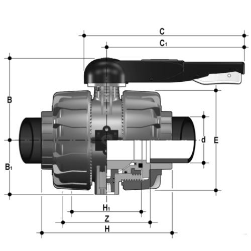 Construction 2-way True Union ball valve with locked carrier and lockable union nuts. - Size range: DN 10 ÷ 50 - Nominal pressure PN 16 with water at 20° C - Temperature range -40 °C ÷ 140 °C Coupling standards - Welding: EN ISO 10931. Can be coupled to pipes according to EN ISO 10931 - Flanging system: ISO 7005-1, EN ISO 10931, EN 558-1, DIN 2501, ANSI B.16.5 cl. 150 Reference standards - Construction criteria: EN ISO 16135, EN ISO 10931, Test methods and requirements: ISO 9393 - Installation criteria: DVS 2201-1, DVS 2207-15, DVS 2208-1 - Actuator couplings: ISO 5211 - Valve material PVDF Seal material, FPM (standard size O-Ring, EPDM on request); PTFE (ball seats) - Control options: Manual control; electric actuator; pneumatic actuator |