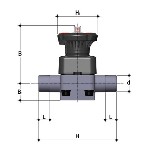 - Diaphragm valve with maximized flow rate and DIALOCK® lockable handwheel - Size range DN 15 ÷ 65 - Nominal pressure PN 10 with water at 20° C - Temperature range 0 °C ÷ 60 °C Coupling standards - Solvent welding: EN ISO 1452, EN ISO 15493, BS 4346-1, DIN 8063, NF T54-028, ASTM D 2467.Can be coupled to pipes according to EN ISO 1452, EN ISO 15493, DIN 8062, NF T54-016, ASTM D 1785 - Thread: ISO 228-1, DIN 2999, ASTM D 2464 - Flanging system: ISO 7005-1, EN ISO 1452, EN ISO 15493, EN 558-1, DIN 2501, ANSI B16.5 Cl.150, JIS B2220 Reference standards - Construction criteria: EN ISO 16138, EN ISO 1452, EN ISO 15493 - Test methods and requirements: ISO 9393 - Installation criteria:DVS 2204, DVS 2221, UNI 11242 - Valve material Body: PVC-U, Bonnet and handwheel: PP-GR, Position indicator cap PVC, Diaphragm material EPDM, FPM, PTFE (on request NBR) - Control options: Manual control; pneumatic actuator |