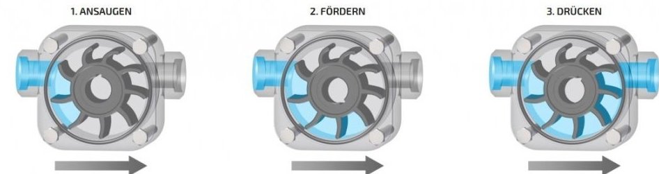 The replaceable impeller wheel is available in the following material: NBR, EPDM, CR, FKM, FPM and TPU. Our flexible impeller pumps can be used with different drives: with electric motors, air motors, V-belt drive, hydraulic motors, with a drill or with a cordless screwdriver via adapter. How does an impeller pump work? The impeller wheel rotates in the eccentrically shaped housing, so that the bending of the individual blades creates a vacuum and fluid is drawn into the vacuum. In this process, the fluid itself serves as lubrication for the impeller in the housing. To avoid possible damage to the pump, each ZUWA impeller pump can be equipped with an electronic dry running protection. |