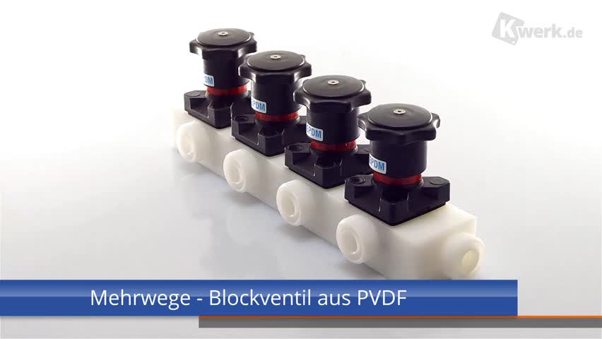 Multi-way valve in block construction It is possible to equip the block with pneumatic or manual hand wheels accordingly. Possible holes for the introduction of measuring points, such. PH, REDOX or temperature are possible. The connections can be shown as threads, flanges or in other versions. Customer benefits - Customized plant design - Extremely compact valve solution - Shorter installation times - System integration possible - Increased plant reliability thanks to fewer connection points Technical data - Produced from a single block of material; standard materials PVC-U, PP, PE, PP natural, PVDF, further materials on request - Standard connections, such as threaded sockets, solvent cement spigots, butt weld spigots, union ends and flanges, can be used |