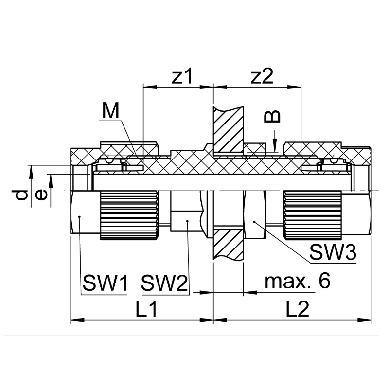 Straight bulkhead fitting made of PVDF, type SO 21521, feedthrough length max. 6 mm