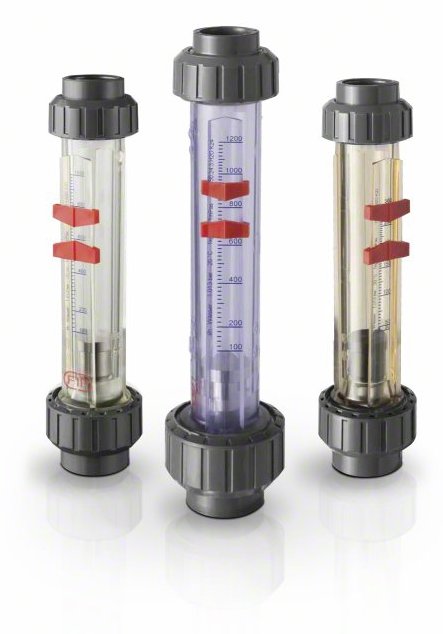 VARIABLE AREA FLOW METERSSERIES EASYFLOWVariable area flow meters are optical measuring devices for determination of the volume flow rate of fluids and gases in industrial pipework systems. The flow meter is radially removable and consists of a measuring cone with scale and an inside-lying float. Variable area flow meter - function The inside-lying float is lifted by the flowing liquid and the related flow speed until a balance is reached between the lifting force of the medium itself and the weight of the float. The volumetric result can now be read out on the scale in the measuring cone, on the top edge of the variable area flow meter. Ideally the variable area flow meter should be selected on the basis of the required flow rate being always located in the last third of the measuring cone. On request, the cone can be equipped with special scales for media with different densities. If the float is equipped with a magnet, for instance pumps and valves can be operated by attaching a break contact and a make contact at the measuring cone. Generally, variable area flow meters have a measuring range of 1:10. They are cost-effective measuring instruments for optical control of the volume flow. Our series Easyflow is easy to handle and offers a wide field of uses for various media. The area of application can be enlarged by the implementation of accessories. Easyflow is a series of variable area flow meters made of plastic, suitable for measuring the volumes of transparent liquids and gases passing through closed pipe systems. The flow meters can optionally be used for flow monitoring, by upgrading them with contact switches. For including them into the pipeline, a large number of connection variants is available. PVC screw fittings with gluing sleeves are offered as standard, however depending on pipe systems also screw fittings with threaded sockets, butt weld or socket weld ends and flanges are available. Advantages: Large selection of measuring ranges Large number of connection variants Eight different nominal sizes Five different measuring tube sizes According to medium different measuring tube materials Diverse float materials Exchangeable measuring tubes Radially removable with installed pipeline Environmentally friendly design High flexibility as well as customer-specific solutions Short delivery times for standard and special scales Type for liquids: 700 und 750 FS Type for gases: 701 und 751 FC Measuring range for water: 1,5 l/h bis 50.000 l/h or/and % Standard media: water, 30% HCL, 30% NaOH, 50% NaOH, air 0 bar rel. Nominal sizes: DN 10, 15, 20, 25, 32, 40, 50, 65 Accessories: contact switch Accuracy class: Type 750: class 4 according to VDE/VDI 3513, sheet 2 Type 700: class 2,5 according to VDE/VDI 3513, sheet Missing data as well as other dimensions and materials on request. All items you will also find in our webshop. You can configure the flow meter yourself. |