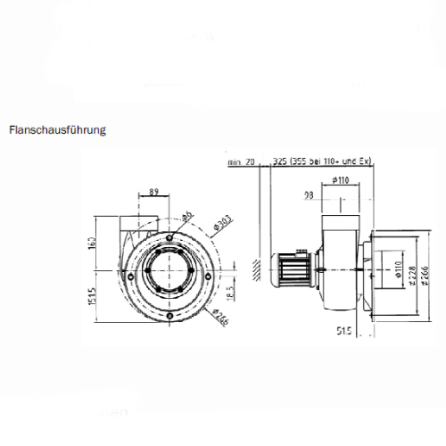 Drum impeller made of PPs, injection molded design with backblading for guaranteed negative pressure at the shaft feedthrough during operation, housing position GL, discharge direction adjustable in 8x45 degrees